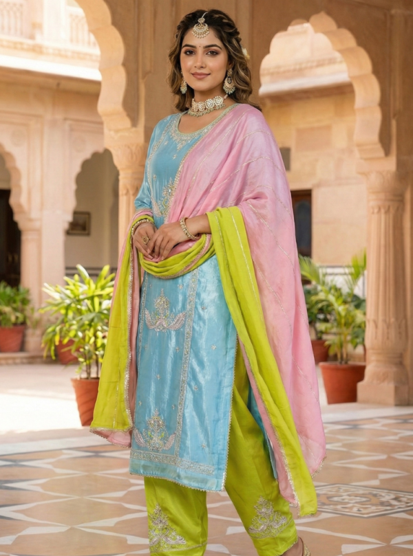 The Aqua Blush Diamond Crush Suit Set blends soft royal tones with premium festive detailing. Designed in elegant pastel shades, this set offers both sophistication and comfort.