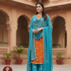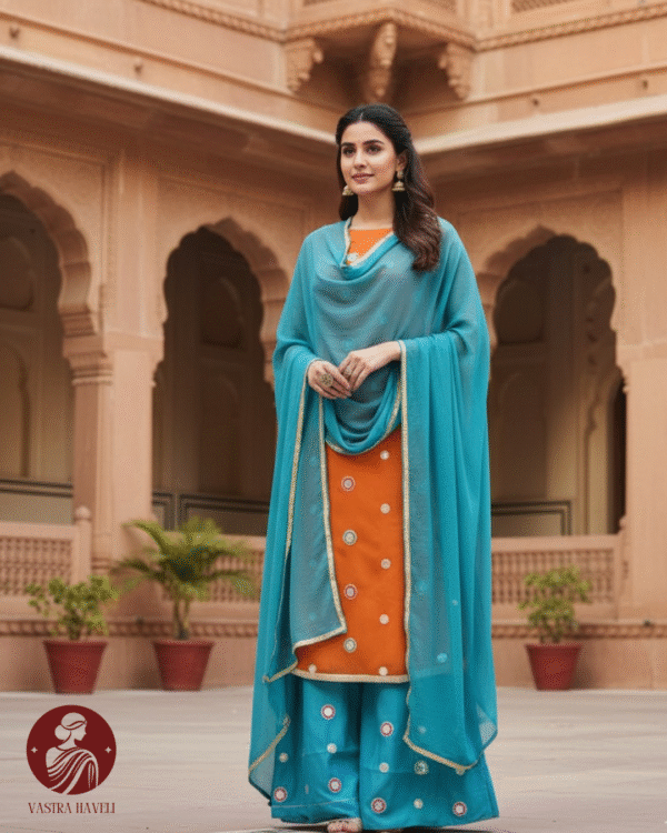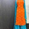 A radiant orange and blue georgette suit set with embroidered motifs and chiffon dupatta – perfect for adding brightness to your wardrobe.