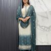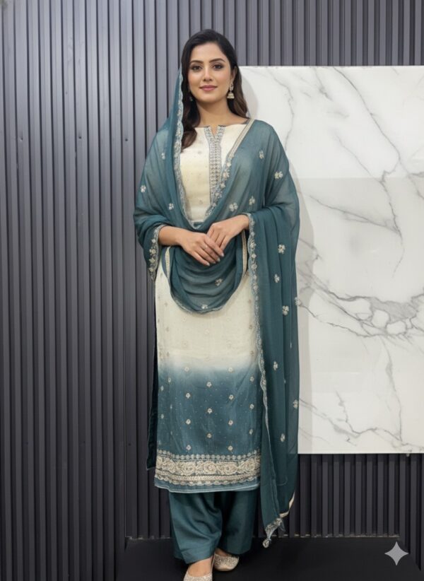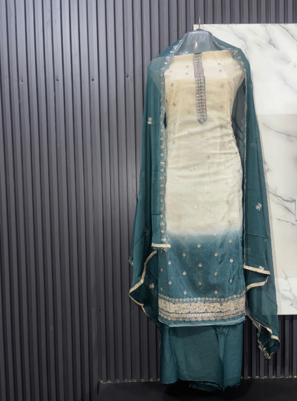 Rooh-E-Ferozi Glass Silk Suit Set brings a refreshing and luxurious aesthetic with its serene teal gradient and intricate craftsmanship.